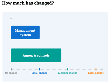 En resumen, los cambios en la parte principal de la norma son pequeños y se pueden hacer con bastante rapidez, con solo ligeros cambios en la documentación y los procesos. Los cambios en los controles del anexo A son moderados y pueden abordarse principalmente añadiendo los nuevos controles a la documentación existente.