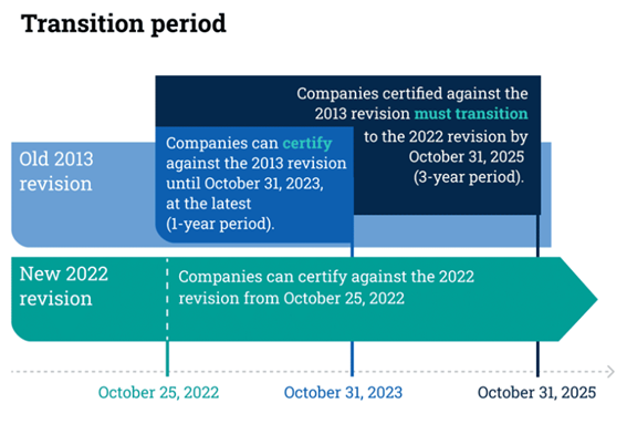 Según el documento "Requisitos de transición para ISO / IEC 27001: 2022" del Foro Internacional de Acreditación, para las empresas que ya están certificadas según ISO 27001: 2013, la transición a ISO 27001: 2022 debe completarse antes del 31 de octubre de 2025.